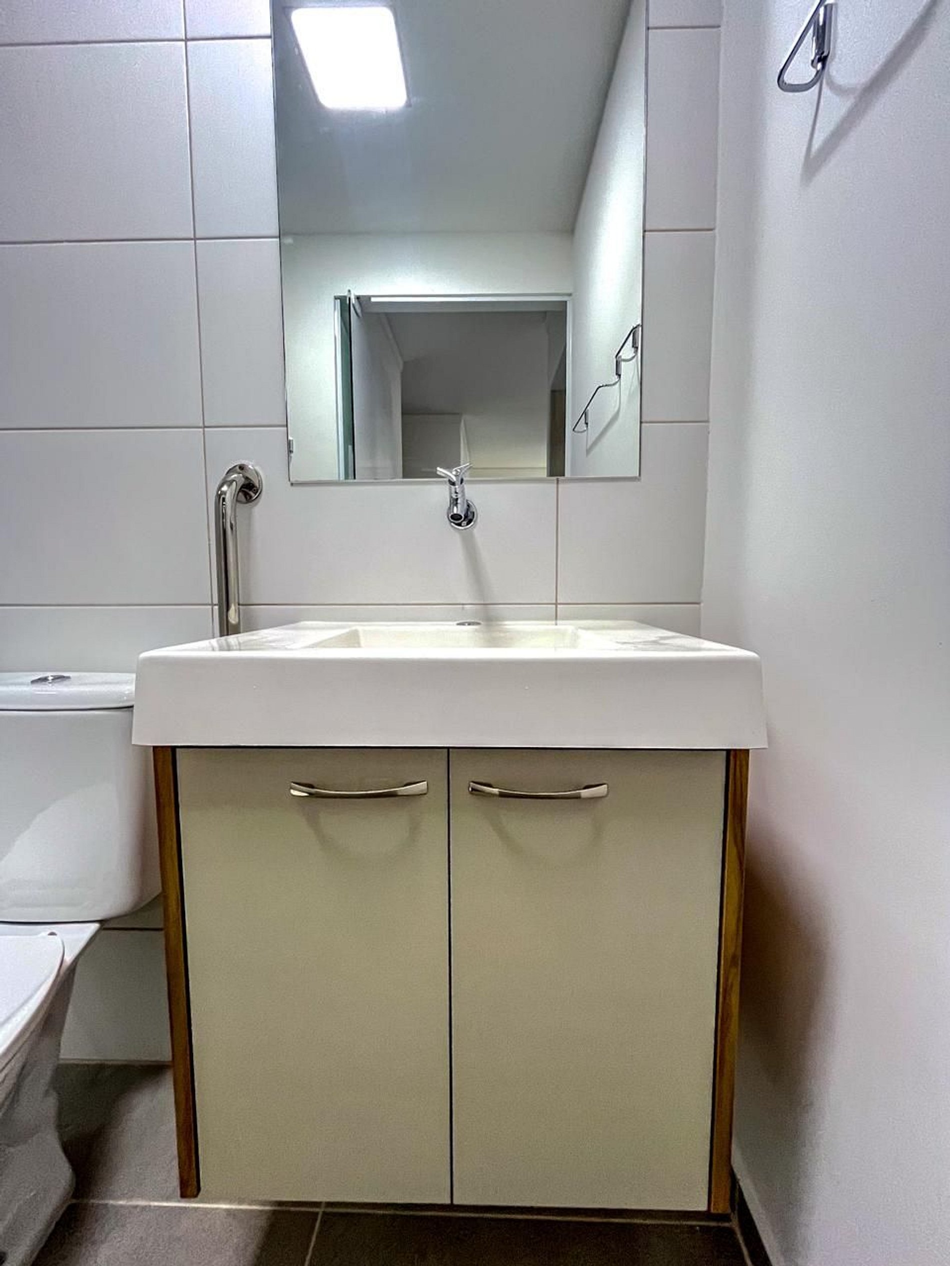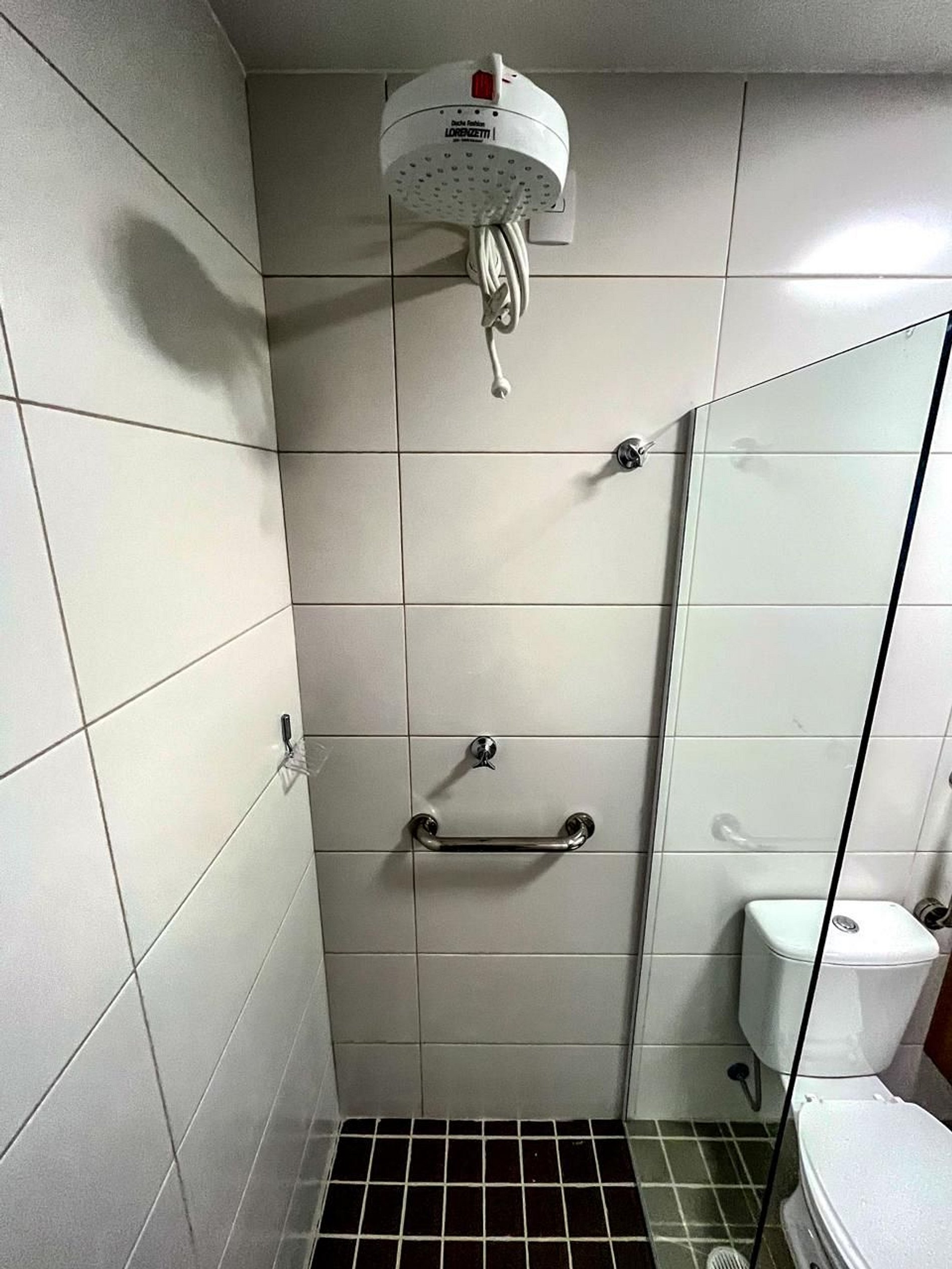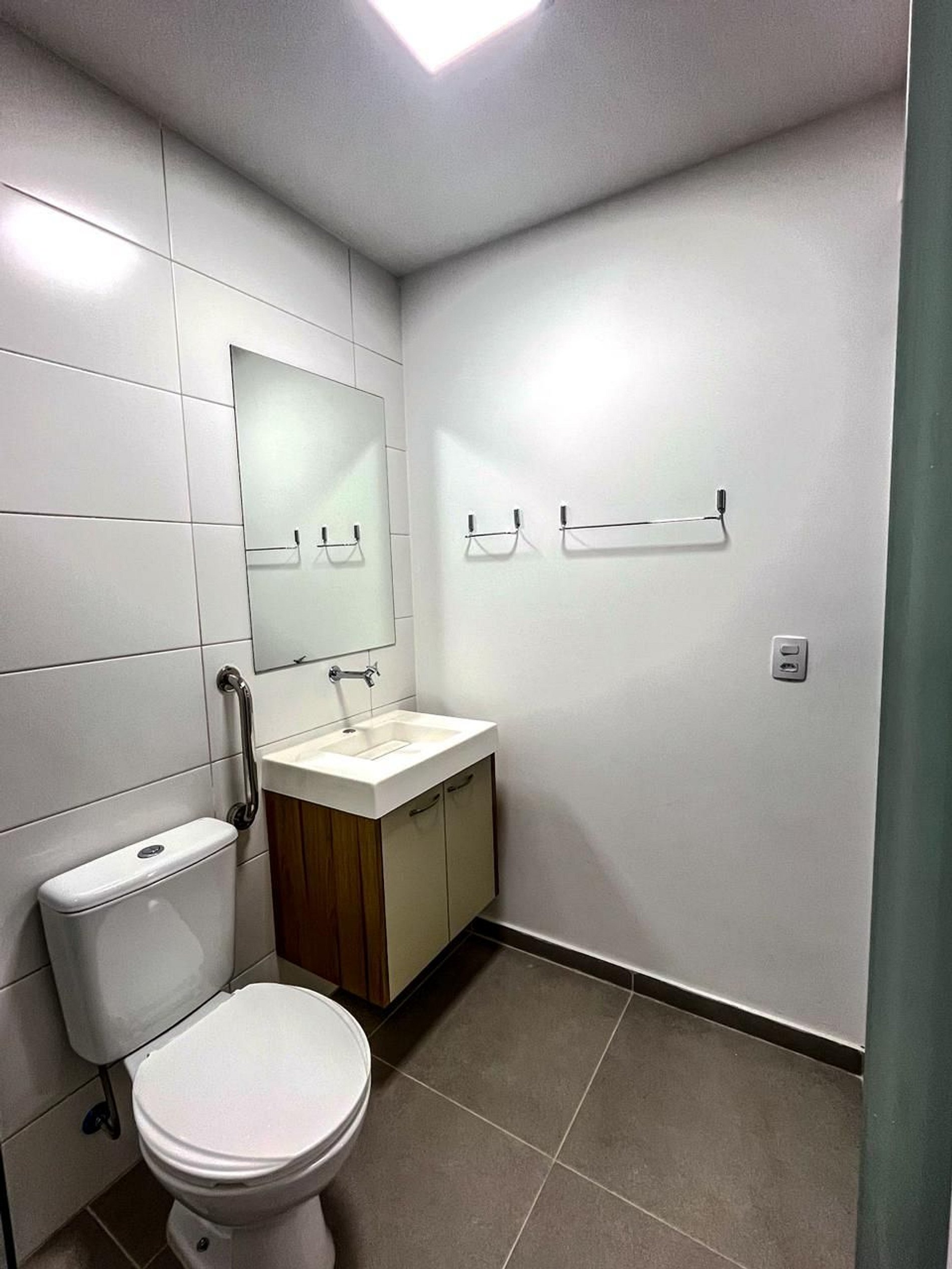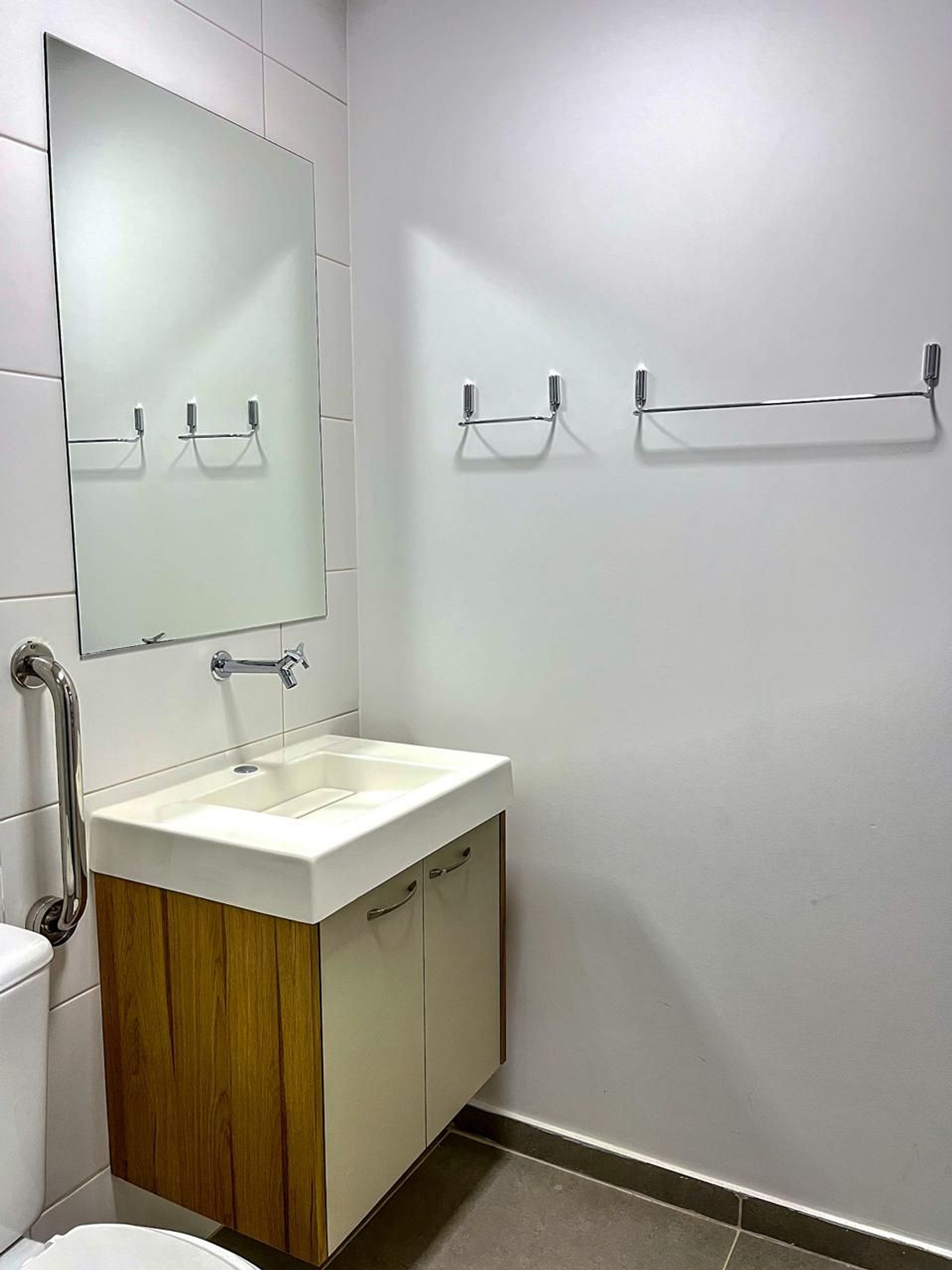 Banheiro adaptado com barras de apoio