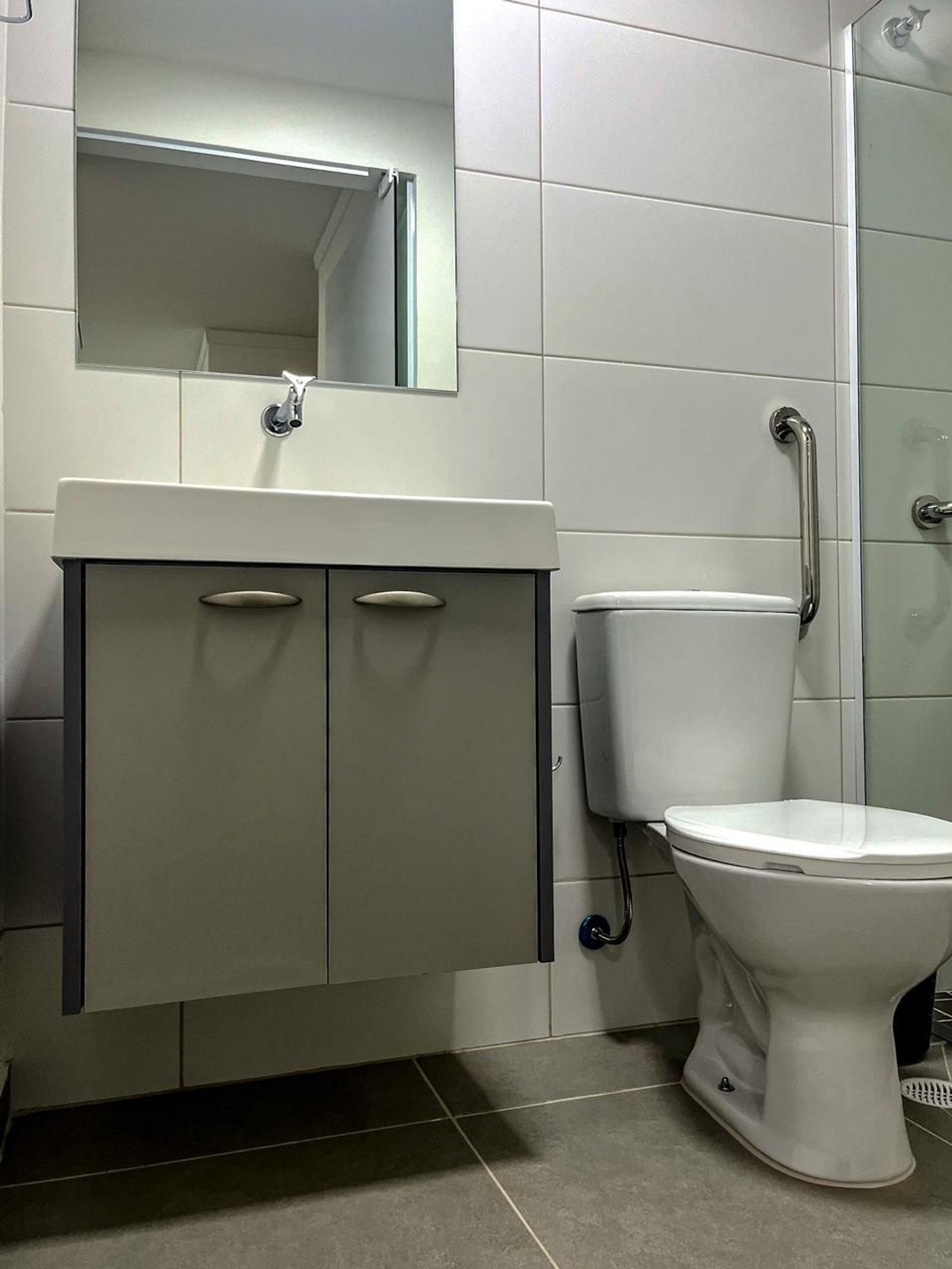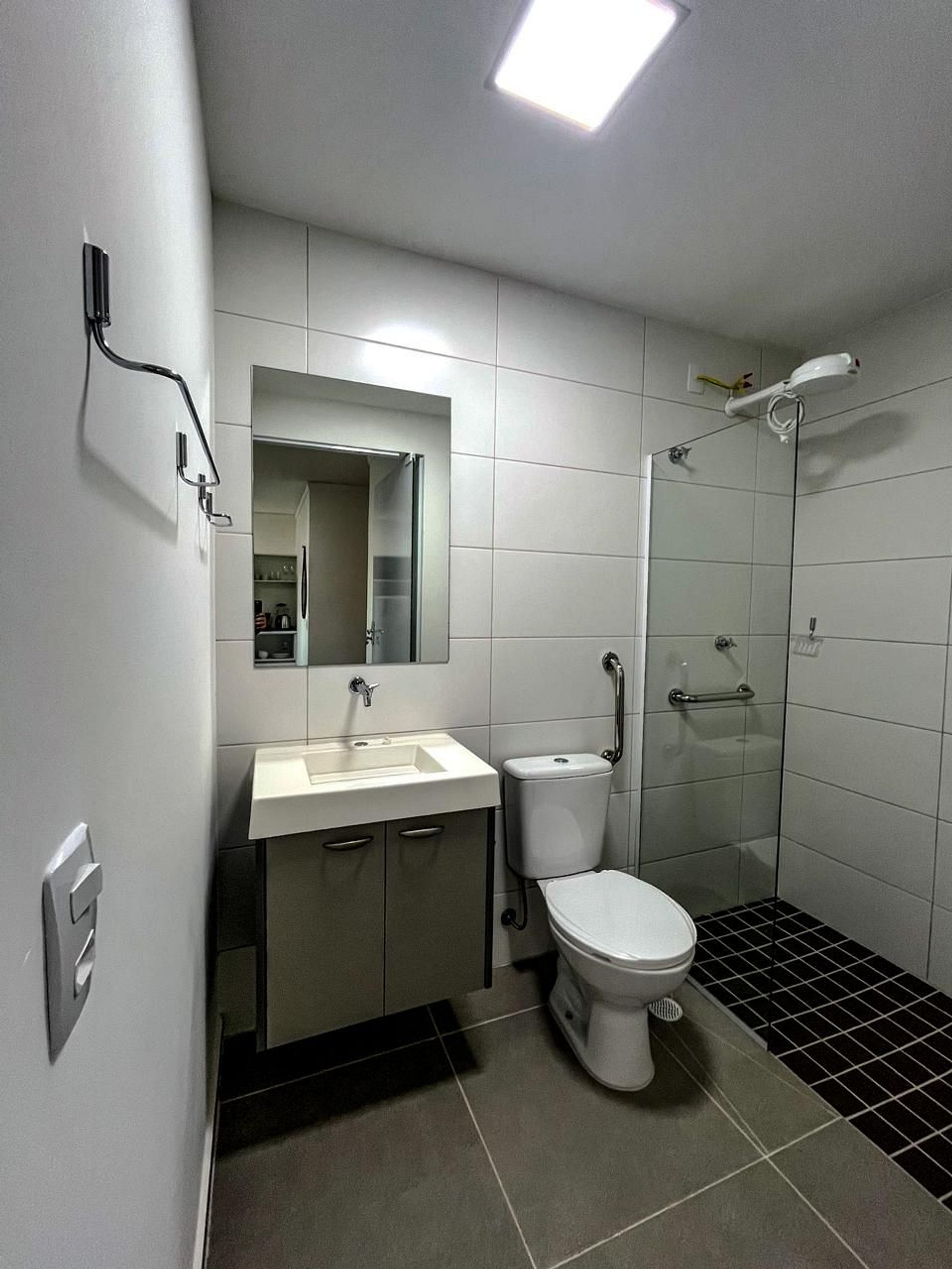 Banheiro adaptado com barras de apoio