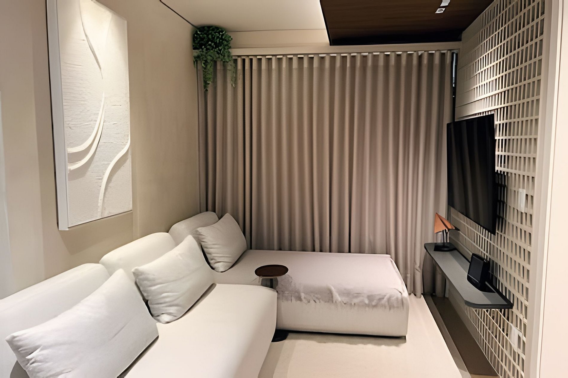 - suíte com cama queen, blackout 100% e ar condicionado.